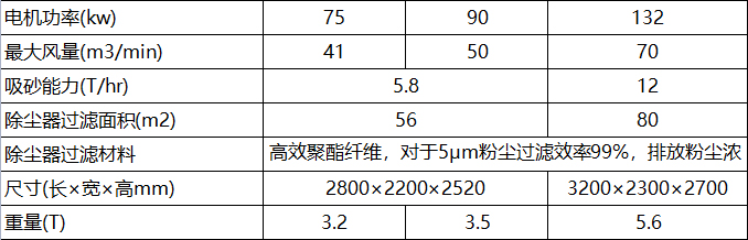 設備由動力系統、除塵器、儲料斗、電控箱等組成 吸砂能力:5-12t/hr 除塵器過濾面積:56-80㎡