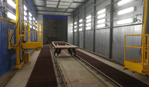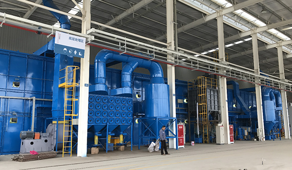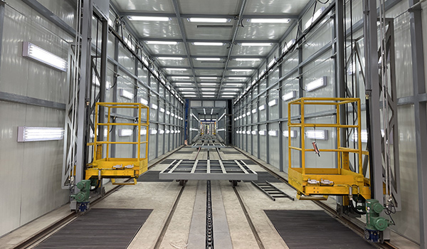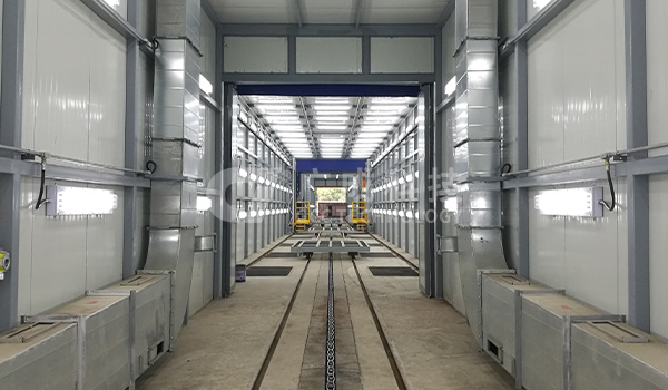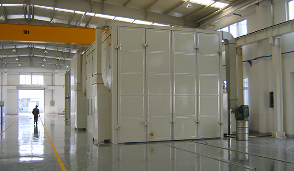 設(shè)備由噴砂房、清理房、底中面漆噴漆房、流平房、烘房、強(qiáng)冷室及輸送系統(tǒng)、電氣控制系統(tǒng)等組成,工藝要求不同,設(shè)備配置略有差異